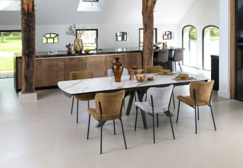 Cette chaise Lea a un cadre simple à 4 pieds et un look classique. Les pieds fins de cette collection donnent à la chaise un aspect très élégant. La chaise a une hauteur d'assise de 52 cm et une hauteur de dossier de 86 cm. La chaise Lea est standard en tissu chenille plat très doux Lecce et est disponible en 5 couleurs différentes : bleu, crème, vert, ocre et pêche.
