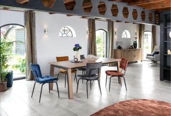 La chaise de salle à manger Ysia a un design classique avec une touche moderne. Le dossier et le siège matelassés sont frappants. Comme le cadre passe sur le dos, vous avez immédiatement une poignée pratique sur la chaise, sans toucher le tissu. Pour le revêtement de cette chaise de salle à manger, on a choisi pour le tissu Karese dans la couleur off black. Ysia est disponible en plusieurs couleurs.