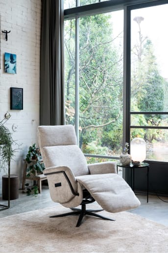 Vous voulez vous détendre après une longue journée ? Avec ce fauteuil relax élancé et mince Luderitz, ce n'est pas difficile, car d'une simple pression sur un bouton, il passe en mode relaxation ! L'idéal est que le repose-pieds, le dossier et les jambes peuvent également être ajustés séparément ; Luderitz dispose en effet de trois moteurs. L'appui-tête électrique vous permet de vous allonger encore plus confortablement. Luderitz repose sur un pied de couleur graphite qui pivote dans toutes les directions et est doté d'une fonction de retour automatique. Le fauteuil relax a un joli accent métallique dans l'accoudoir qui se déplace lorsque vous ajustez le fauteuil électriquement. Luderitz est également disponible sans batterie. Préférez-vous cette version en tissu Enzo de couleur champagne ou l'autre variante en cuir dans laquelle Luderitz est disponible ?