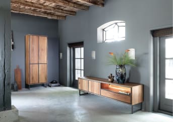 L'armoire Grenade a un modèle élancé, mais offre beaucoup d'espace grâce à sa hauteur de 210 cm. Grâce à sa largeur limitée de 75 cm, vous trouverez rapidement une belle place pour elle, surtout si vous êtes fan d'un intérieur chaleureux avec une touche industrielle. Le placage de manguier fumé a une teinte très chaude, qui contraste magnifiquement avec les encadrements et les pieds en métal foncé. L'armoire a 4 portes, toutes équipées d'un système push-to-open.