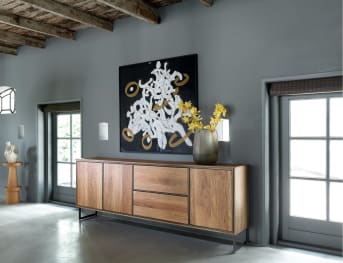 Un espace de rangement en abondance avec ce magnifique buffet Grenade. Le placage de manguier fumé a une teinte très chaude, qui contraste joliment avec les encadrements et les pieds en métal foncé. Cela prouve une fois de plus qu'un look industriel peut aussi être très chaleureux. Ce buffet de 240 cm a 3 portes et 2 tiroirs, tous équipés d'un système push-to-open. Si vous avez un peu moins d'espace disponible, le buffet de 200 cm ou de 160 cm pourrait être une option.