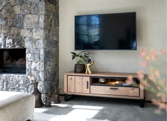 Ce lowboard de 150 cm de large fait partie de la collection Édimbourg de H&H. Idéal comme meuble-tv pour les petites pièces ou comme meuble d'appoint bas dans le séjour, il compte une porte, un tiroir et un compartiment ouvert qui peut contenir un décodeur TV. Le compartiment ouvert est joliment illuminé par un éclairage LED subtile. Cette collection comporte des touches de métal noir. En outre, les meubles sont fabriqués en Primo Laminato (HPL), facile d'entretien.