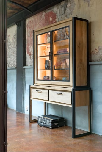 Ce buffet industriel de la collection Brasilia attire vraiment l'attention à l'intérieur. L'armoire fait 140 cm de large et 200 cm de haut. La partie supérieure a 2 grandes portes vitrées derrière lesquelles brille un éclairage LED. La partie inférieure comporte 2 tiroirs. Le buffet est en placage de chêne de couleur Railway Brown et comporte des accents métalliques robustes.